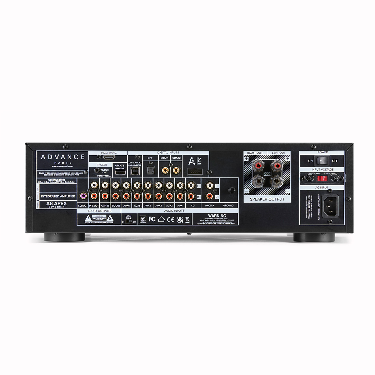 Der A8 APEX ist ein hybrider integrierter Verstärker, inspiriert von A10 und A12, der ECC81/12AT7-Röhren und Transistoren kombiniert und eine Leistung von 2x75W in Klasse A/B bietet. Er bietet Eingänge für verschiedene Quellen (analog, digital, USB, HDMI e-ARC) und erweiterte Funktionen (1 Subwoofer-Ausgang, Pre-Out, Amp-In).