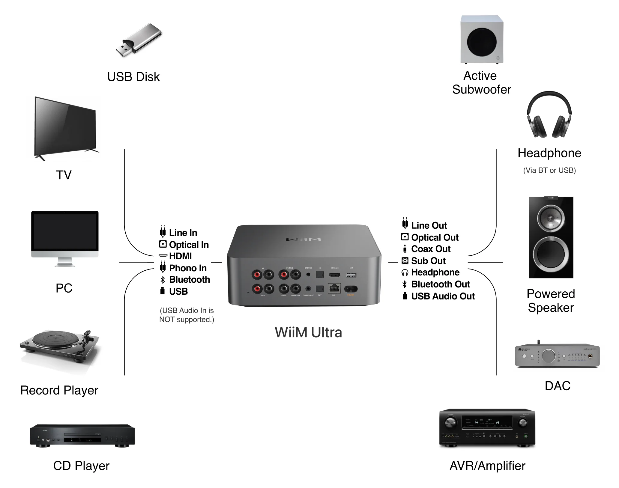 WiiM Ultra’s comprehensive connectivity suite offers USB, Optical, Coaxial, RCA outputs, and HDMI ARC, plus multiple inputs including RCA, Phono, and Optical. It’s designed to flawlessly integrate with both digital and analog systems, enhancing any audio setup with versatility and superior sound.